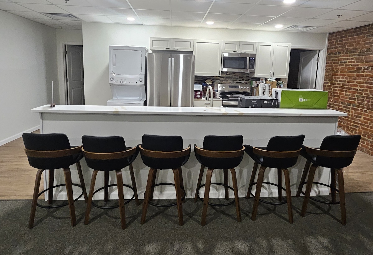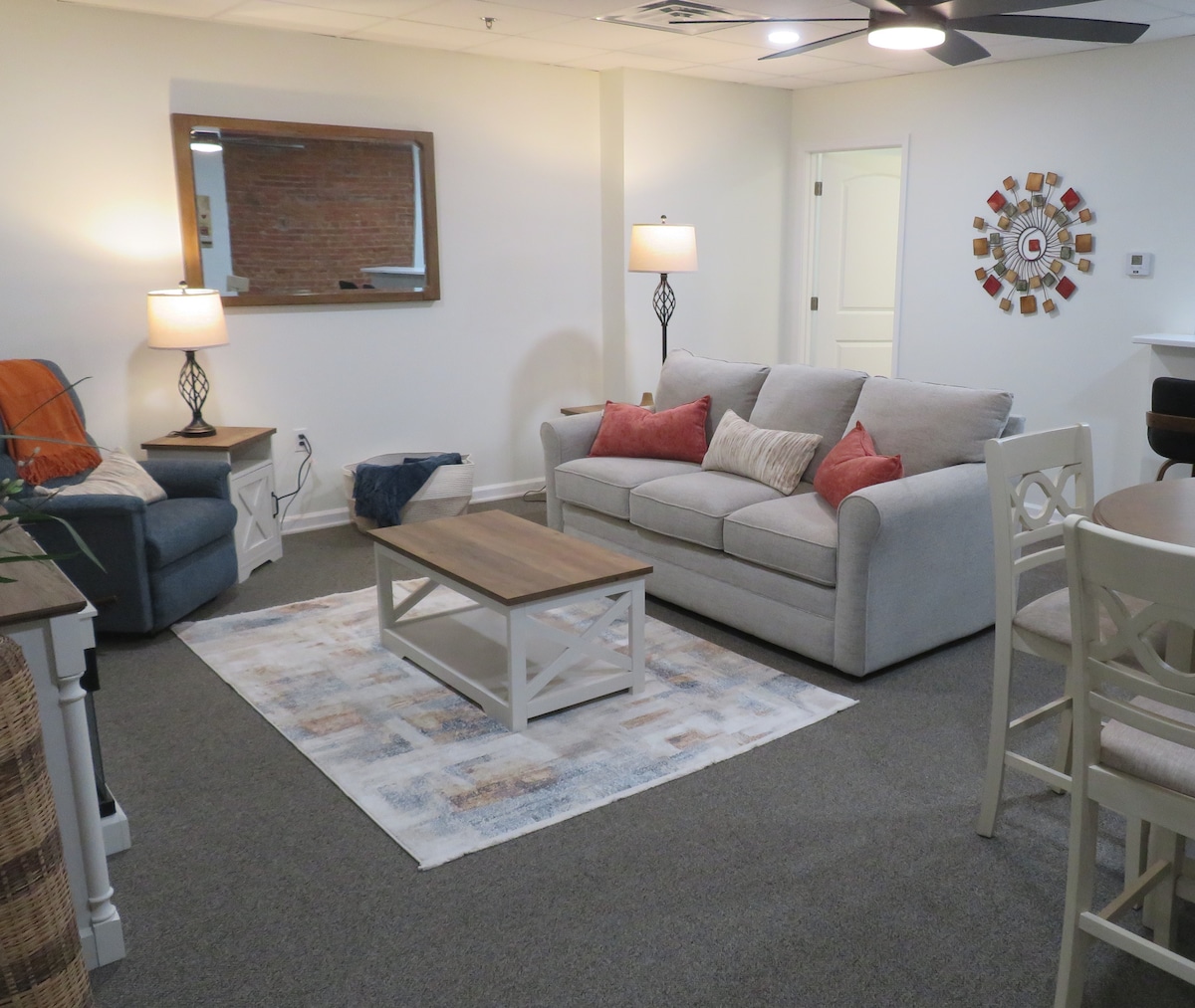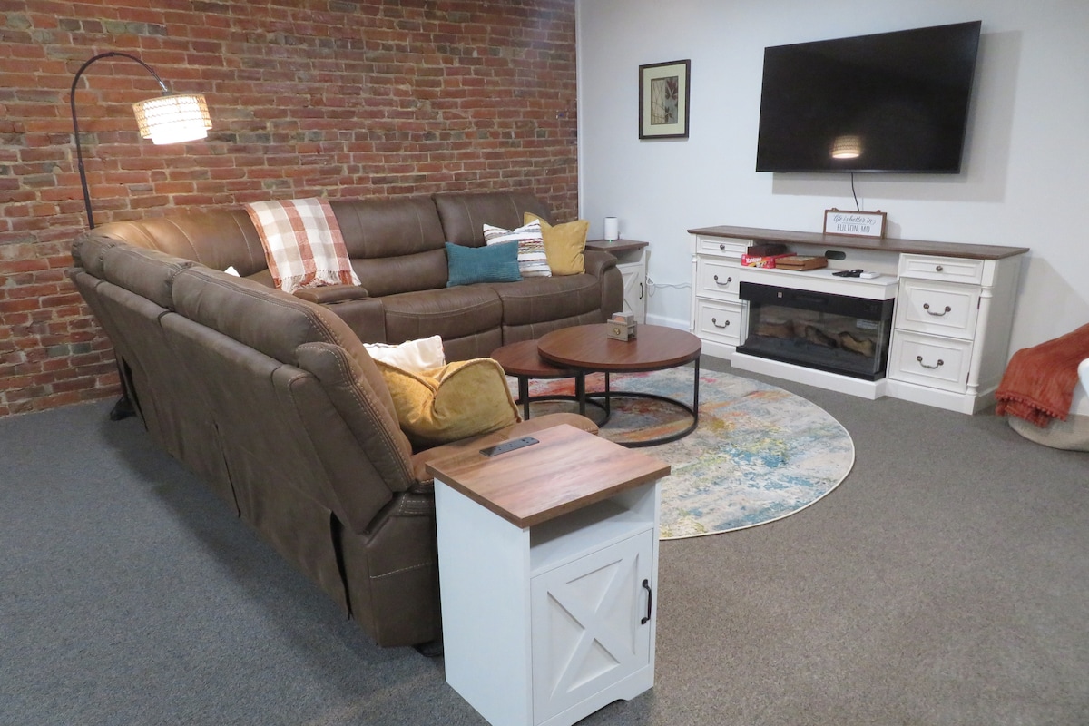This large apartment has all of the best comforts of home. 2 Queen bed suits that overlook the historic Court Street, in the center of the Fulton Brick District with their own bathroom. The living space includes a large recliner sofa, breakfast bar, electric fireplace, 55" TV and large dining table. The kitchen features Keurig Coffee maker, stoneware dishes, and all of the utensils including a wine glasses and opener! Choose cotton or flannel sheets for your stay!