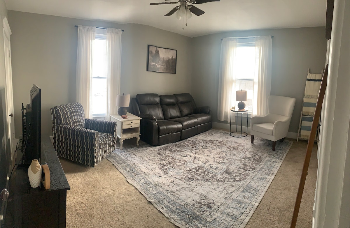 This large apartment has all of the best comforts of home. 2 Queen bed suits that overlook the historic Court Street, in the center of the Fulton Brick District with their own bathroom. The living space includes a large recliner sofa, breakfast bar, electric fireplace, 55" TV and large dining table. The kitchen features Keurig Coffee maker, stoneware dishes, and all of the utensils including a wine glasses and opener! Choose cotton or flannel sheets for your stay!