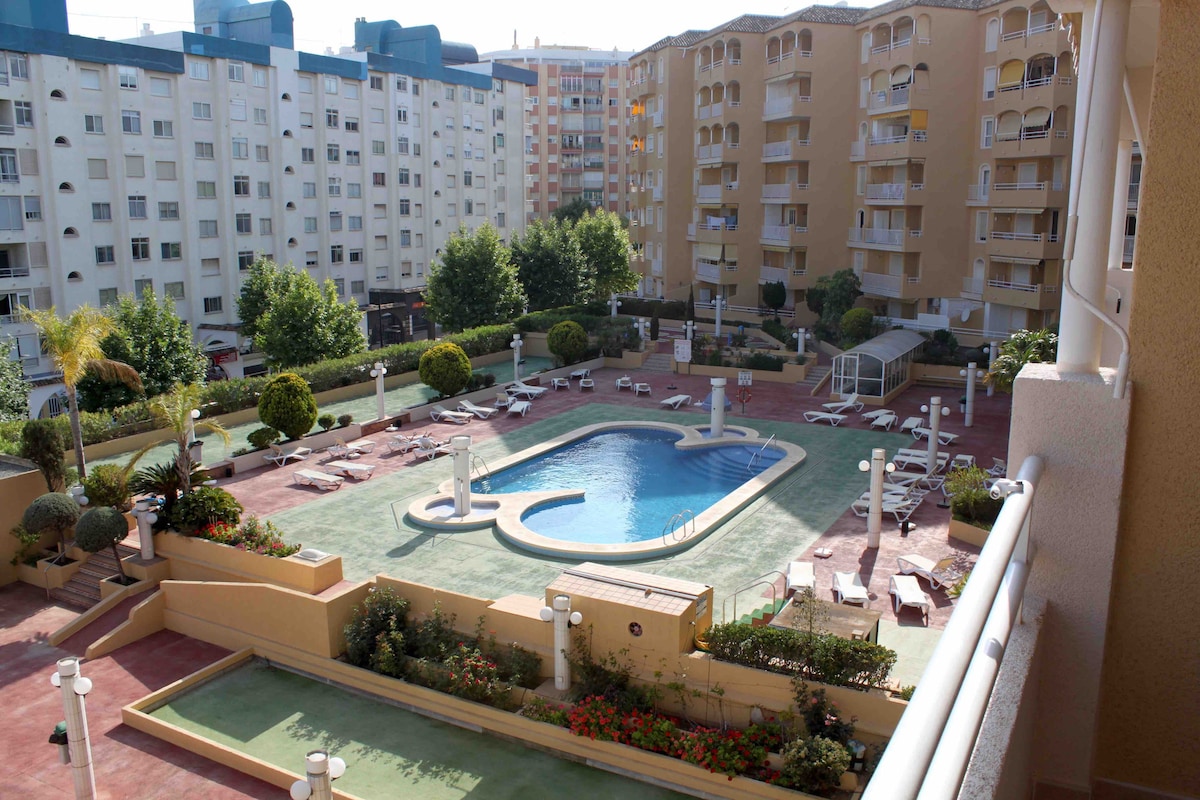 Precioso apartamento en Calpe. Magnifica situación a 3 minutos de la playa andando y rodeado de bares, restaurantes y supermercados. Tiene 2 Habitaciones (cama de matrimonio y dos camas) y un baño, cuenta con A/C. La finca posee 2 piscinas, hamacas, pista de petanca, mini golf, jacuzzi, gimnasio, sauna, mesa se ping pong. Conexión wifi de 1000Mb perfecta para teletrabajar. Disponible cuna, sillas cubos y palas para la playa, sombrilla... Se incluye plaza de aparcamiento cerrada.