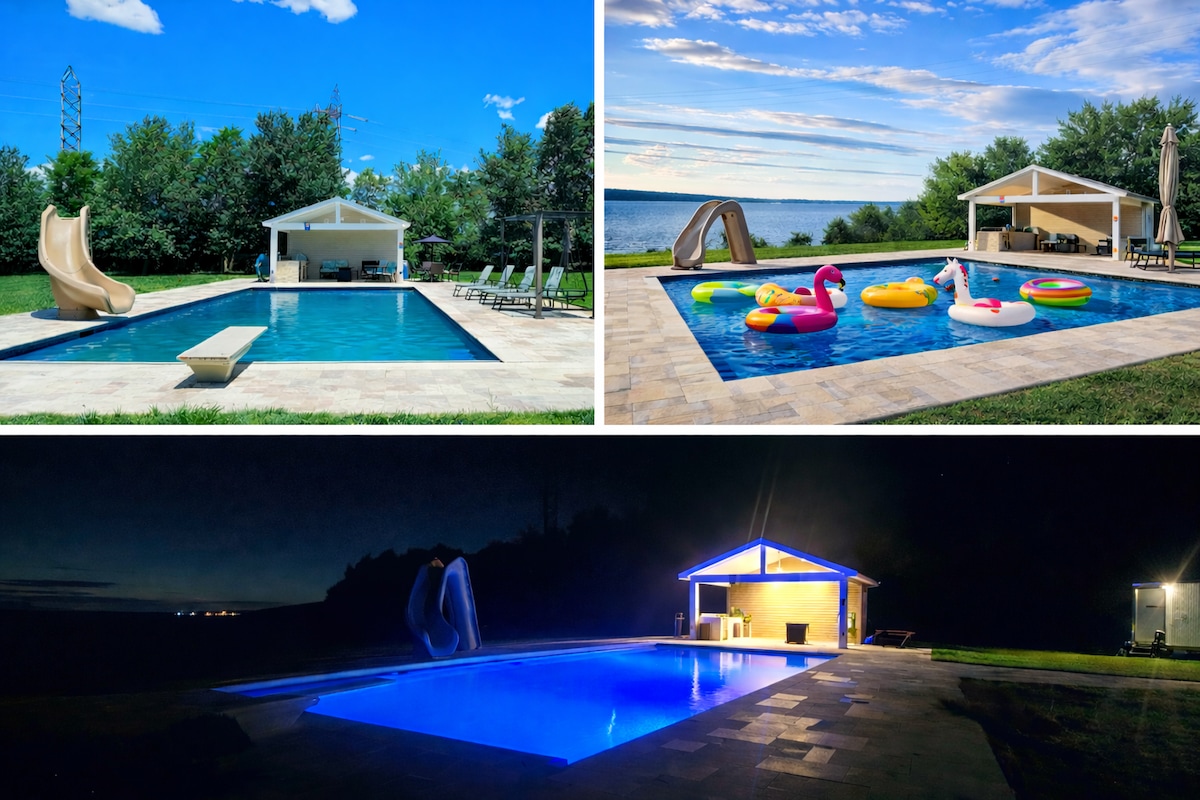 Escape to this luxurious two-story waterfront home with two master suites, sleeping up to 12. Enjoy a gorgeous pool, large decks with scenic views, and a deep-water pier perfect for boating and fishing. Gather around the fire pit or stay active on the private pickleball and tennis court. Inside, spacious living areas offer comfort and style, ideal for families and groups. A serene retreat for relaxation and adventure alike. Book now for an unforgettable waterfront getaway!