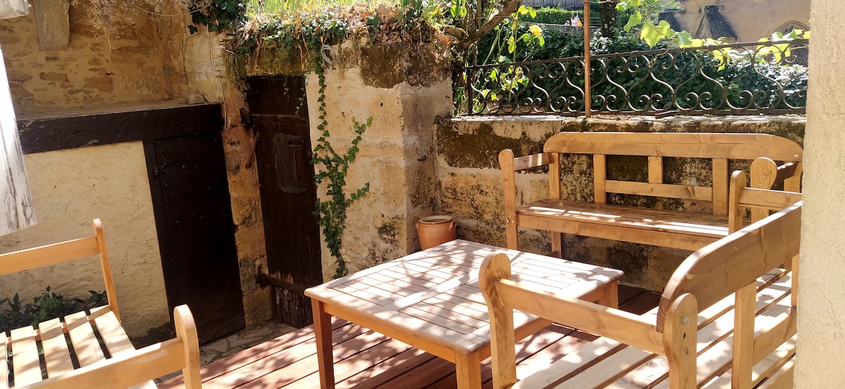 Situé au coeur du centre historique de Sarlat dans la célèbre rue Montaigne, dans une maison datant du Moyen Âge rénovée en 2020 en valorisant au maximum son patrimoine (pierre, parquets), l'appartement de 64 m2 propose une terrasse et une vue exceptionnelle sur la Cathédrale St Sacerdos et les jardins des Enfeux. A noter : pour les groupes ou les grandes familles, il est également possible de louer la maison entière, jusqu'à 14 personnes ("La Demeure de Bacchus", annonce Airbnb n°51800236).