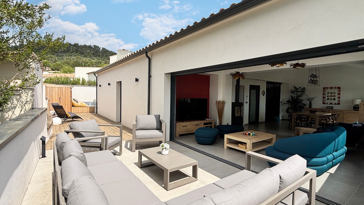 Welcome to our private oasis for 1 or 2 people in the heart of la roquette! Enjoy the heated salt water pool surrounded by tropical plants. The space will offer you a haven of shade and tranquility. Have breakfast, an aperitif, or cook poolside in the outdoor patio kitchen. The bedroom is air conditioned and equipped with luxury hotel quality bedding and organic linens, to ensure that your stay is relaxing and memorable.