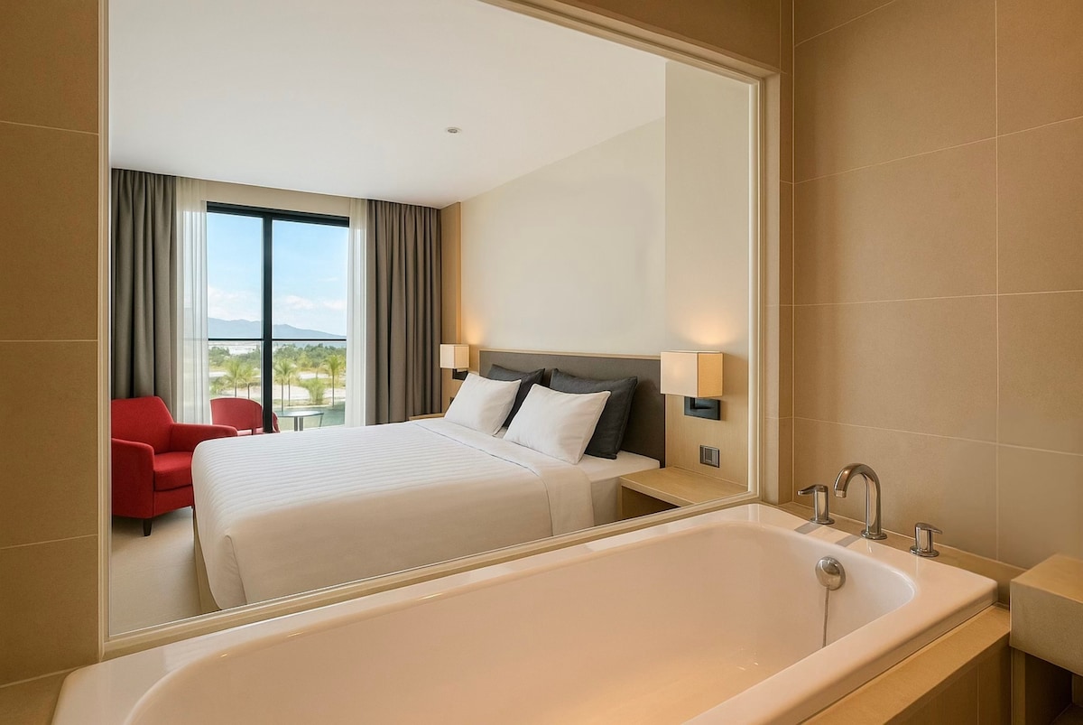 Modern seaside apartment with stunning sea & pool views at Arena Cam Ranh. Just steps from Bai Dai Beach, perfect for couples & families seeking a relaxing escape.