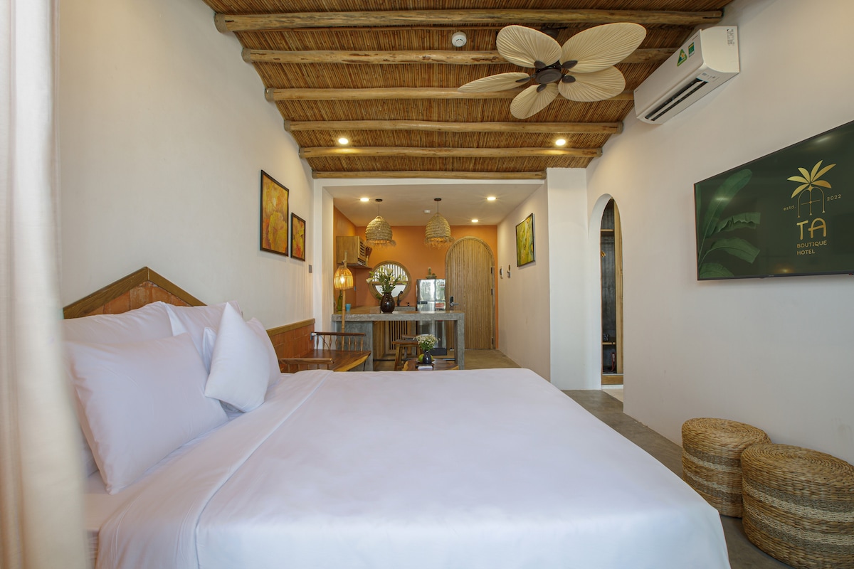 Family rooms lie on the 2nd floor surrounded by flowers and plants. Each room has a balcony with a stunning view of the whole place and the pool. Family Rooms are 60 meters square large. It contains 02 double beds, a bathroom, a kitchen, and a balcony. The room is suitable for 04 adults and 1 kid under 6 years old. Breakfast is NOT included . We have Free bicycles services and Afternoon tea.