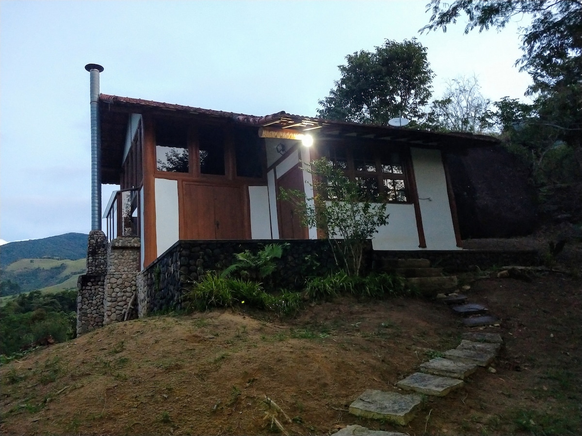 Chalé no alto da morro (já que no Brasil não têm montanha), estrutura de madeira, com mezanino, frente de vidros com visual incrível, lareira para aquecer o friozinho, muita natureza, é perfeito para contemplação da lua e estrelas! Tem 2 quartos com camas de casal e mais 2 colchões de solteiro, todos os espaços no Interior são abertos. É isolado, minha casa fica na propriedade, mas distante uns 80 metros, quem aluga não divide o espaço com outros hóspedes.