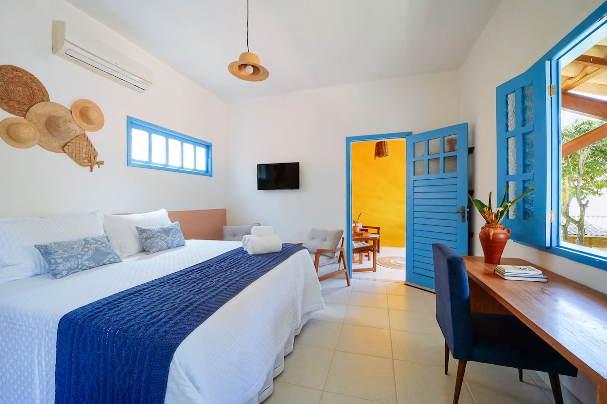 A suíte está equipada com uma cama de casal e uma cama de solteiro, além de ar condicionado Split.