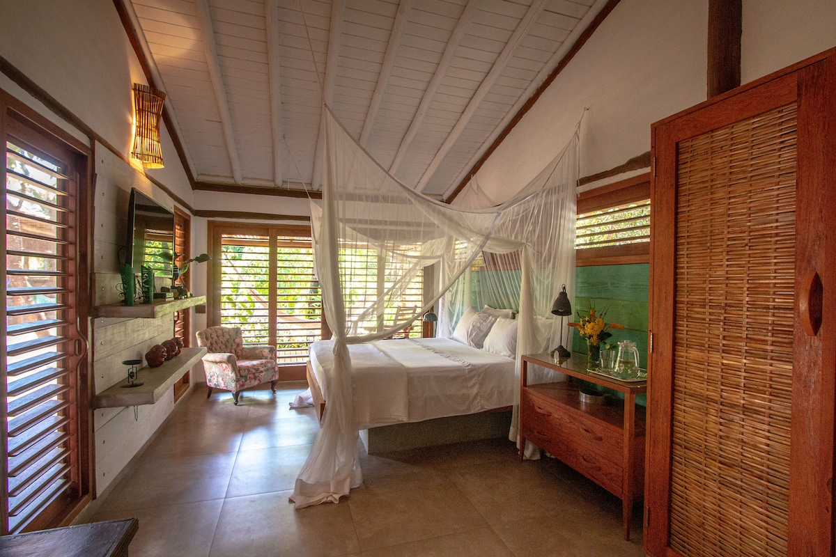 O bungalow Manacá está localizado no Jardim das Bromélias Vilas e Reserva, o santuário privado da nossa família, à beira mar, na Praia de Algodões, Península de Maraú – BA. Aqui a natureza é deslumbrante, te tirar o fôlego! O bungalow é ideal para famílias ou 2 casais, possui 60m2, hospeda de 4 a 5 pessoas e está em perfeito equilíbrio e integração com a natureza. São 2 suítes amplas com ar-condicionado, duchas externas privativas para cada suíte, copa completa e varanda.