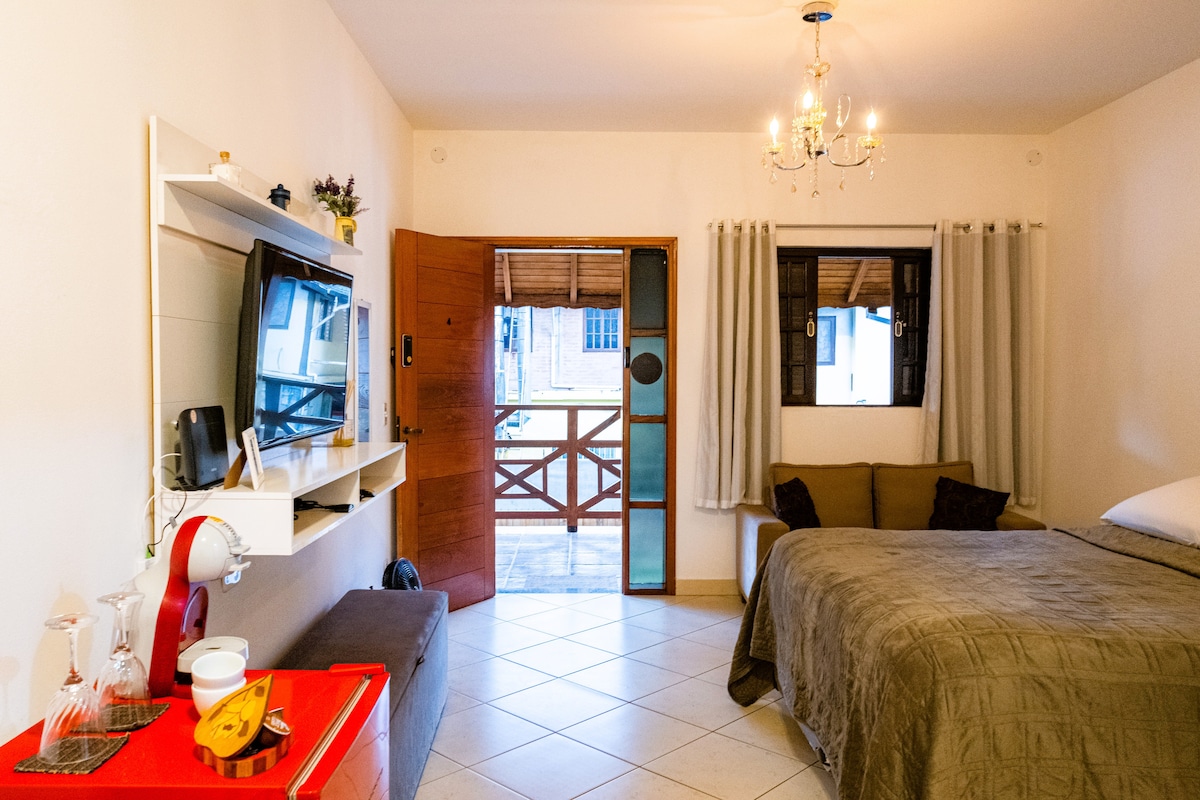 Sejam Bem-Vindos(as) - Studio Essential. -Em 6 X S/JUROS -Fechadura Eletrônica -Estacionamento gratuito - Sem vaga demarcada -Studio - Piso Superior -Conceito Industrial - Com madeira, tijolinho e metalom -Internet com Wi-fi - 600mb -Smart TV 32' - Streamings inclusos -Enxoval Cama - Completo -Enxoval Banho - Completo -Amenities - Shampoo/Condicionador/Sabonete -Cozinha - Compacta, exclusiva e utensílios inclusos -Lareira - Literalmente aos pés da cama -Chuveiro Deca - 12L/min. à Gás