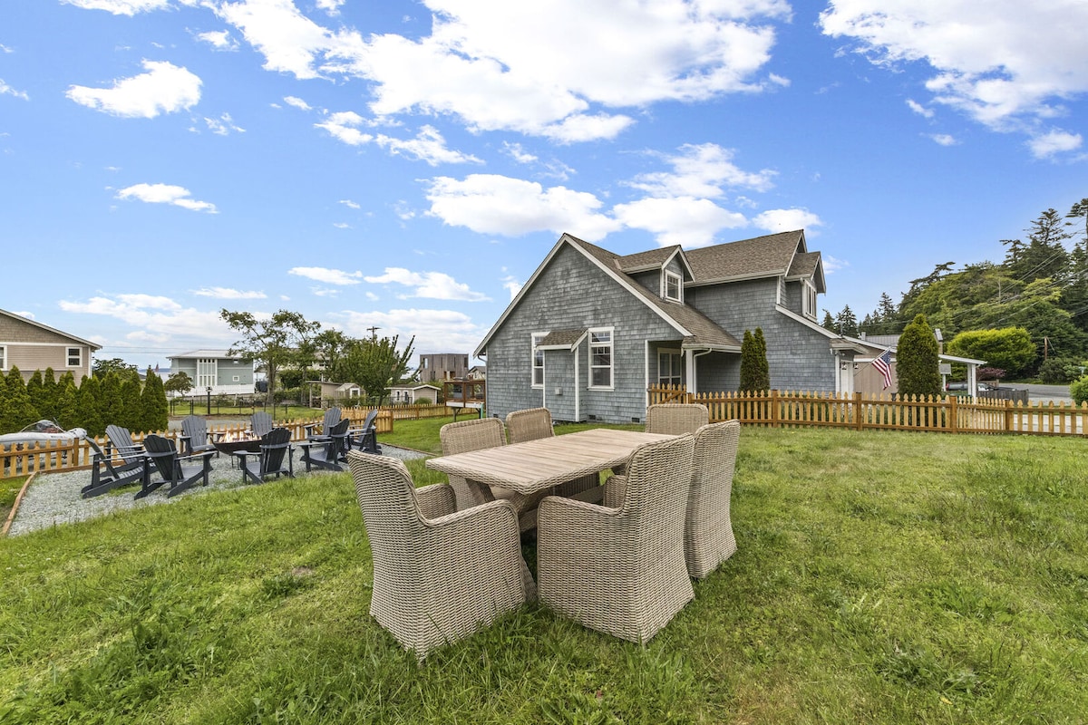 Enjoy breathtaking views of the Sound and Olympic Mountains while relaxing on one of the three decks of our newly remodeled waterfront home. Our modern beach house features three spacious upstairs bedrooms around a separate sitting area, a large living and dining space downstairs, and bathrooms on both levels. You can spot seals, bald eagles, and whales while walking along the no bank beach steps from our front door. Sip wine around the propane fire pit while enjoying the magnificent sunset.