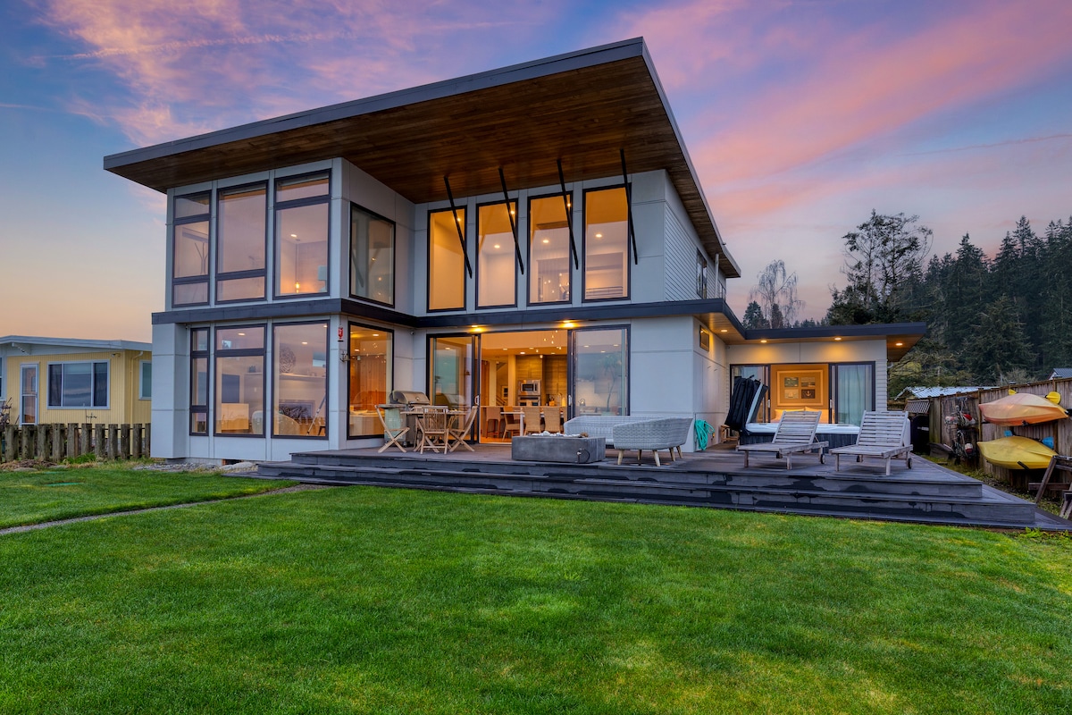 Enjoy breathtaking views of the Sound and Olympic Mountains while relaxing on one of the three decks of our newly remodeled waterfront home. Our modern beach house features three spacious upstairs bedrooms around a separate sitting area, a large living and dining space downstairs, and bathrooms on both levels. You can spot seals, bald eagles, and whales while walking along the no bank beach steps from our front door. Sip wine around the propane fire pit while enjoying the magnificent sunset.