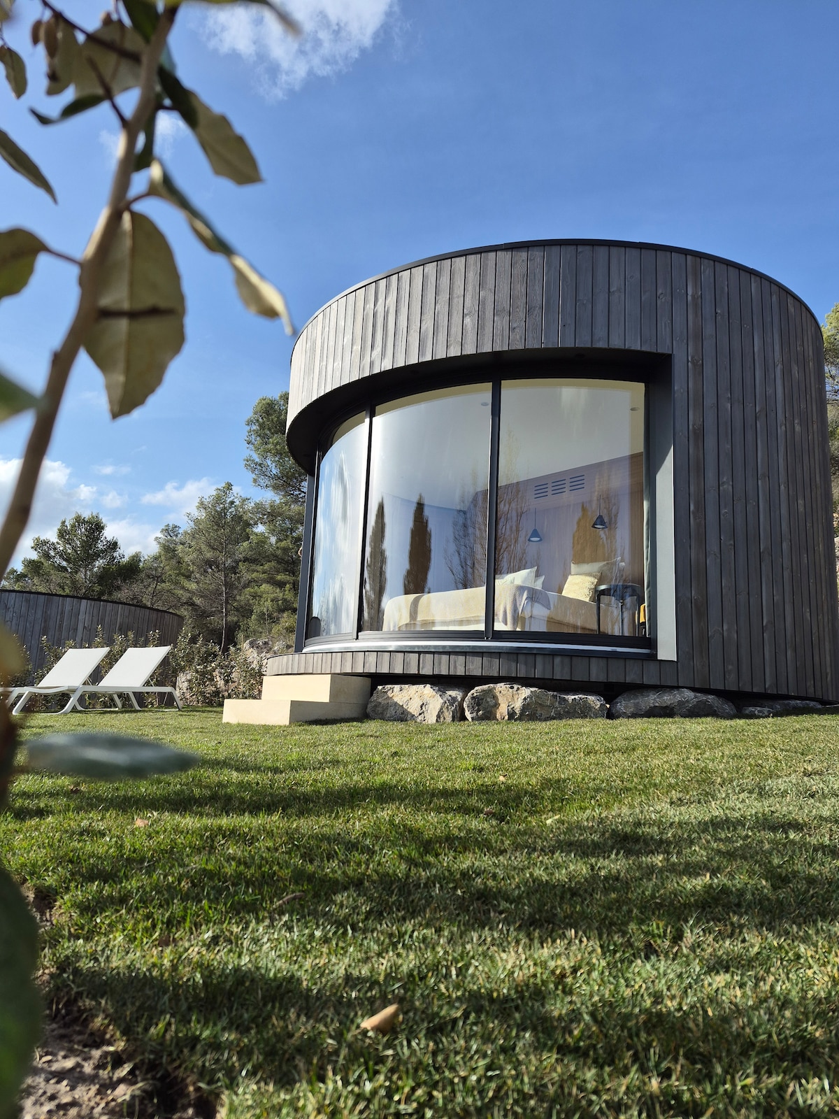 LUMIPOD est fabriqué en France et conçu autour de LUMICENE®, menuiserie courbe et réversible, s’ouvrant à 120° sur la nature. Fermé, LUMIPOD est un cocon protecteur vous projetant dans l’immensité du paysage. D’un simple geste, il s’ouvre et la frontière dedans-dehors s’efface pour laisser place à une expérience inédite. LUMIPOD est composé d’une chambre de 18m carré comprenant un lit suspendu intégré dans une niche. La salle de bain est équipée d’une vasque suspendue, d’une douche et d’un WC.