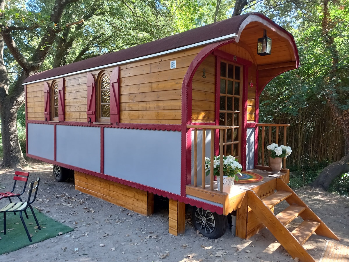 Charmante roulotte de cirque des années 50 aménagée avec amour. 3 m de large sur 11 m de long, entourée d'une terrasse donnant sur un jardin ravissant. Un poêle à bois pour rester bien au chaud en hiver, une chambre avec un lit double, une grande douche, un salon équipé d'un canapé lit pouvant accueillir confortablement une personne en plus. Idéale pour les weekend en amoureux ! We speak english everyone welcome !