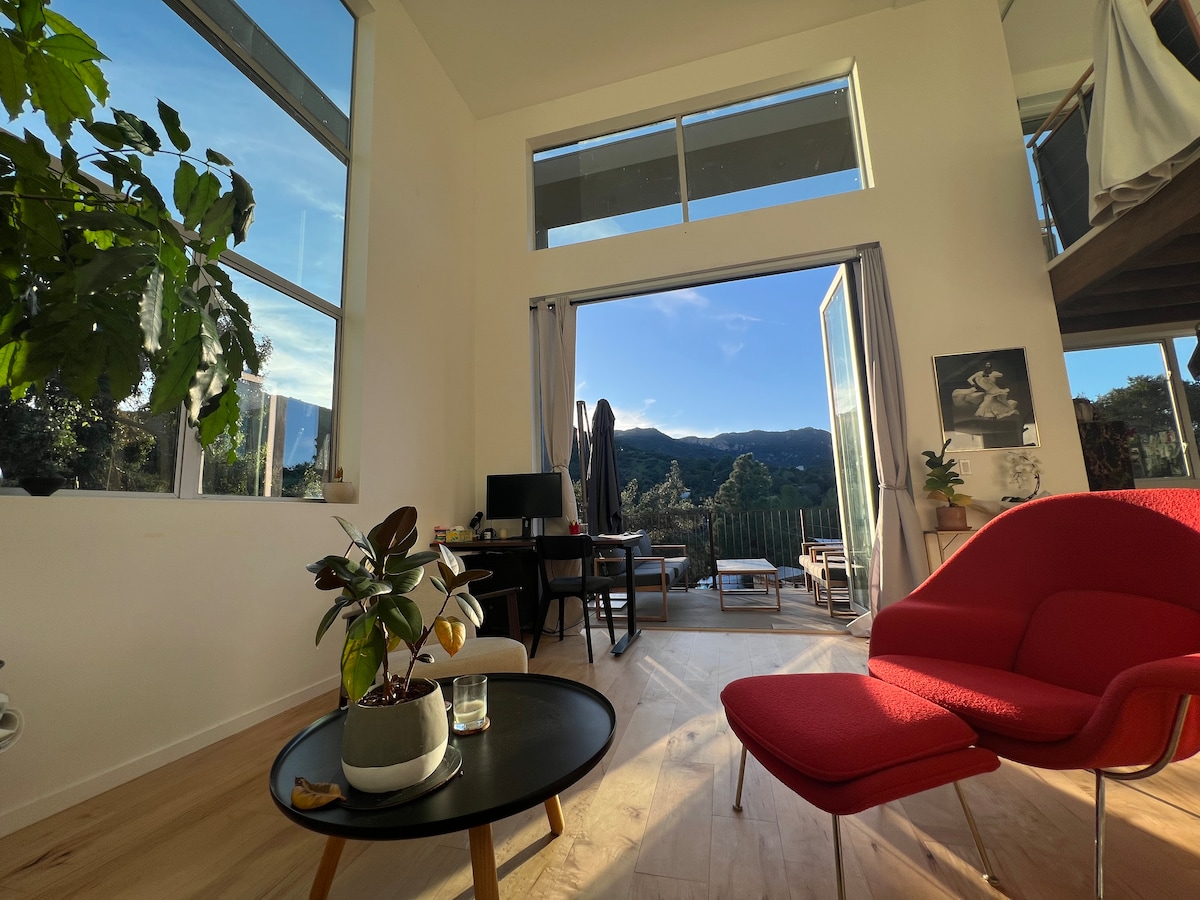 Enjoy being away from the city but still close in a beautiful modern studio with spectacular views of the Malibu ridge. We are extremely lucky that our canyon was saved from the January fires. This studio unit is attached to my house with a completely separate entrance and pathway giving you total privacy. 5mn walk from Topanga hiking trails (biggest enclosed natural park in a city in the world) 10 mn from Topanga beach , 20 mn to Santa Monica and 20 minutes to Woodland Hills. 420 friendly!