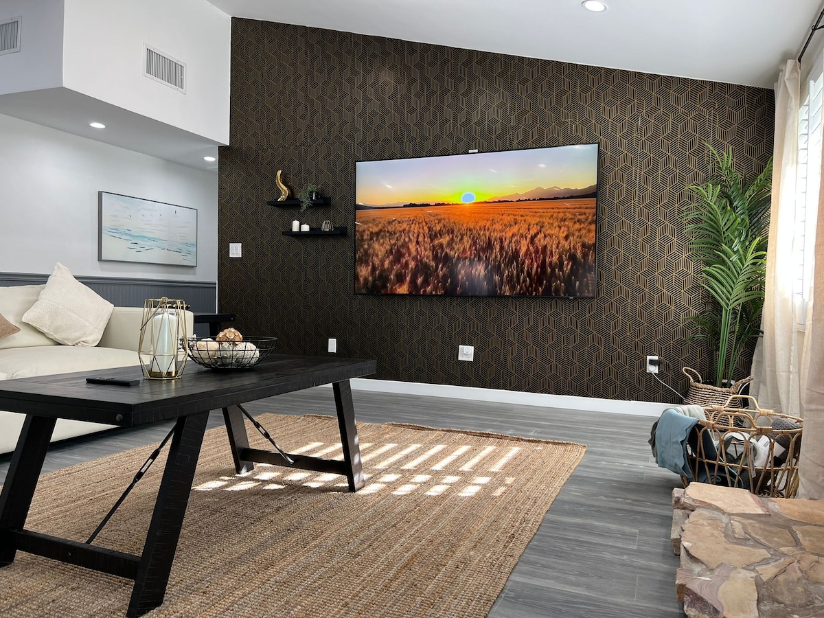BUILT FOR FAMILIES, Los Angeles, less than 25 min from Malibu, Downtown, Hollywood, Venice, Pasadena, Universal City, Beverly Hills, Santa Monica. This home has been Newly Furnished and Completely Remodeled. Heated Salt Water Pool, Fitness Equipment, Full Kitchen, BBQ, Big Screen TVs indoors and outdoors by the Pool. Jacuzzi, Cable, Wi-Fi, Office Work Space, Private Parking, EV Car Chargers, Ping Pong tables, Corn Hole, Floating beds for the pool, Basketball Hoop for the pool and Jungle Gym.