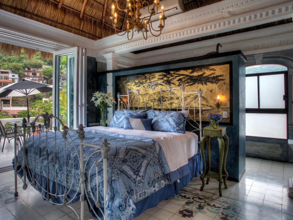 Full private KitchenKing Sized BedDay BedOutside and indoor diningFull bathFold out couch in separate roomElevator accessFully expanding doors to enlarge roomPalapa (thatched roof)Living room and bedroom TVsStunning River ViewPossible to sleep up to four peopleNot far from the vibrant nightlife of Puerto Vallarta's Zona Romantica (Romantic Zone), Rivera del Rio offers a luxurious setting for your wedding, honeymoon, group event, or gay friendly vacation. Rivera del Rio is a sumptuous Mexican bed and breakfast villa, nestled on the verdant banks of the Rio Cuale river. Here, amidst a primitive elegance, one steps back through the ages where Old Town Puerto Vallarta intertwines with the exquisite décor of the legendary “Silver” Maria Cortez.Hailed by Casas and Gente Magazine as one of the world’s top architectural lady designers, N.Y Interior designer Billy Baldwin called her eclectic abode “the house of dreams” - a true Boutique Hotel.