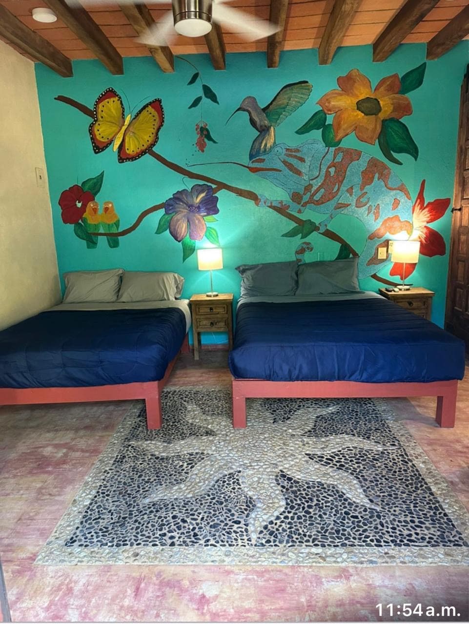 This is a hotel room with 2 queen size beds. NO VIEW. NO BALCONY. NO CHILDREN. PETS are charged $250 mxn per night. Our rooms are basic rooms, fresh with comfortable beds. What does it have? Private bathroom, a small safe box for your passport, money, etc; TV with channels in Spanish and English, Air conditioner, ceiling fan and open shelf. The hotel is located up a step flight of steps. No ELEVATOR ***No recomendable for handicap***UP THE HILL* *STAIRS!!!!*ONLY ADULTS property*