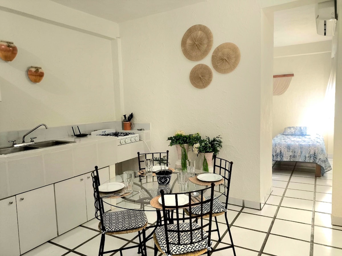 1-bedroom apartment with AC and WIFI, only a 8 minutes drive to the beach! This unique home features AC, WiFi, and a cozy living room with a sofa bed for any addition guests. Enjoy our front patio while having your morning coffee, surrounded by tropical plants and traditional living. We are located 2 blocks from a bus stop, and uber is also available in the area! Enjoy your time in Puerto Vallarta at our amazing home with a modern touch, but still in an area surrounded by traditional living!
