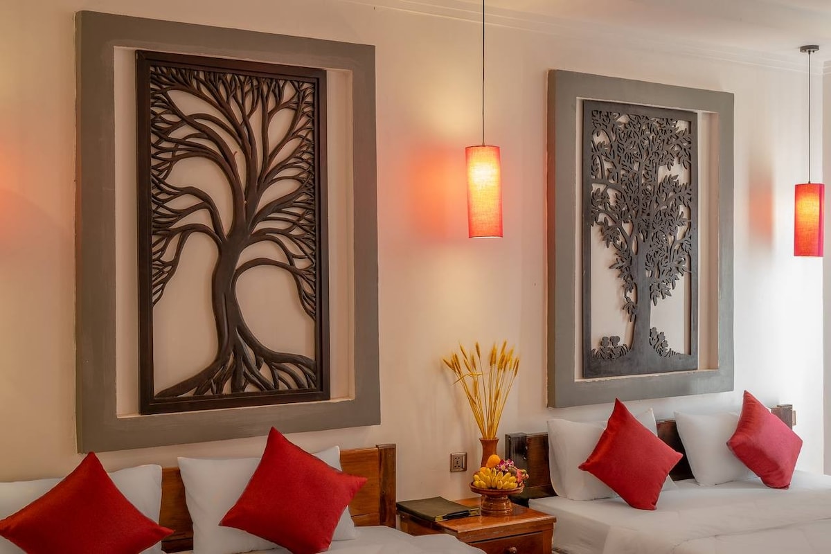 Stay Comfort with Local Charm! Located on the ground floor with easy access, this room features a modern design with polished cement and tiled floors, high-quality linens, and a terrazzo-style ensuite bathroom. Enjoy the unique décor with traditional Cambodian artifacts, blending comfort with cultural charm. Ideal for couples or solo travelers, the room provides both comfort and charm in a beautifully curated space.