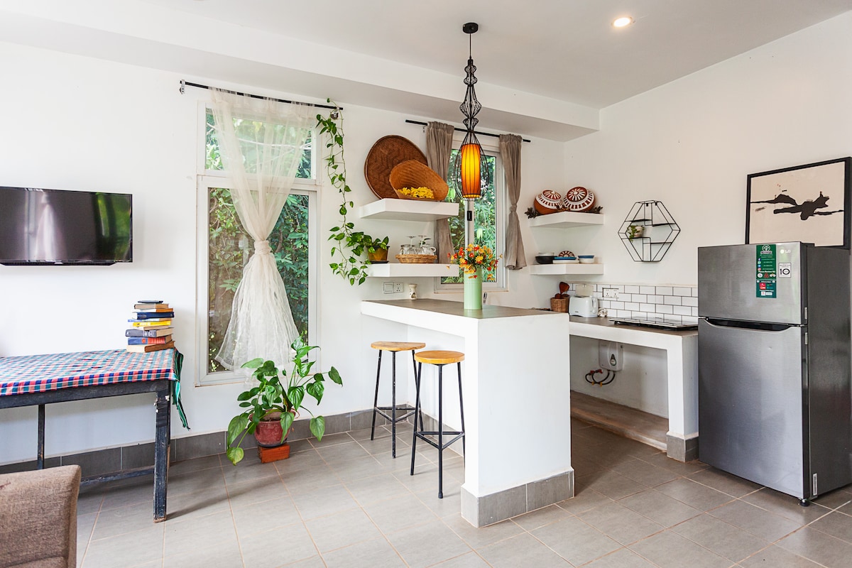Unwind in a tree-shaded bungalow just 2 km from town, with a scenic village walk along the river leading to cafés, markets, and Siem Reap’s vibrant life. Treetop Bungalows offers 6 private, self-contained units with kitchens, living rooms, and balconies set among lush greenery. Share meals in the communal BBQ area, work with strong Wi-Fi, and explore with free bicycles or $1 tuk-tuks. Perfect for travelers seeking both peaceful retreat and authentic local culture.
