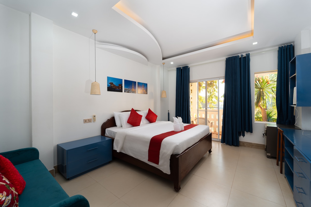 This EXTREMELY SPACIOUS newly built Loft beautifully combines contemporary finishes with trendy style. Built with romance in mind it would suit perfectly to couples, this one-bedroom serviced luxury apartment is designed with cool greens, rich blues and complimented with scattered hand-woven natural-fibre Khmer crafts. It's central Siem Reap - only a 5 minute walk to Pub Street (Old Market Area). The place has access to the Rambutan Resort pool which is set by a beautiful lush garden!