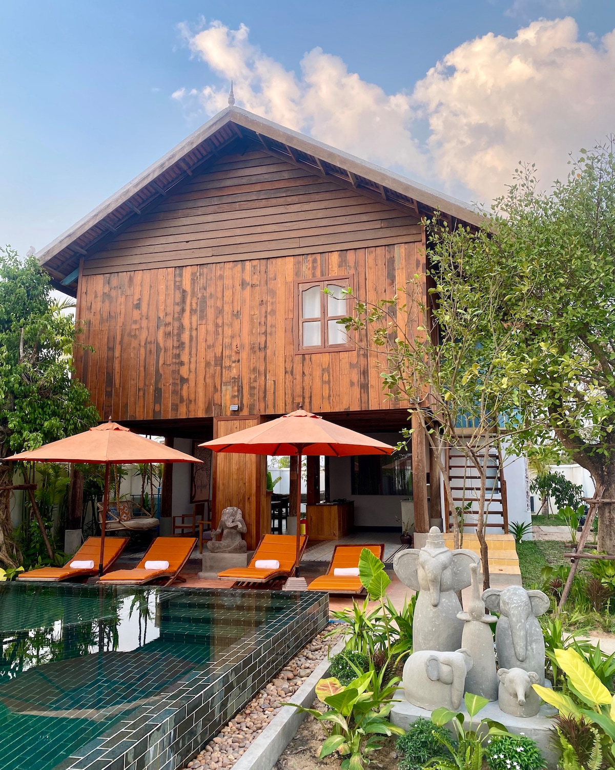 ✨ Welcome to Skyview Retreat Siem Reap ✨ Your private retreat just minutes from town — perfect for families, couples, or friends. Enjoy 2 stylish bedrooms with 3 bathrooms, a spacious living room, a full kitchen, a rooftop bar with sunset views, and a private plunge pool with sunbeds. 🌴 Why You’ll Love It Enjoy morning coffee on the balcony, cook a meal in your fully equipped kitchen, relax in your private pool, and end the day with a rooftop BBQ and sunset drink.