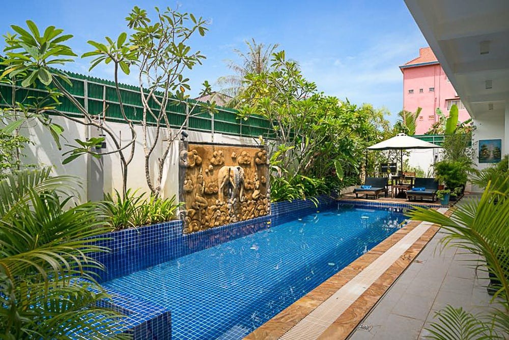 A spacious boutique home of 5 bedrooms with a private pool, built in a unique style of Khmer and Western architecture with an oasis ambiance, located near the largest local market of Siem Reap, only 10 minutes from downtown Pub Street, and 15 minutes to the marvelous Angkor Wat. This beautiful villa is ideal for a group or a family to enjoy a private stay and feel as if you are at home. Authentic Khmer meals, transport/guided tours, and airport transfers could be arranged during the stay.