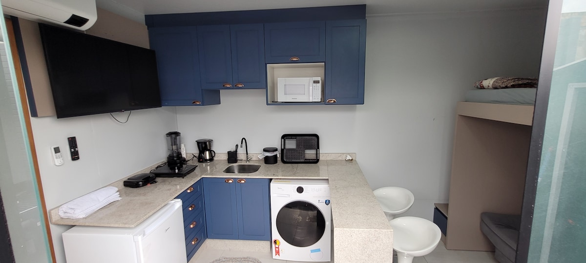 STUDIO 3 PESSOAS TÉRREO Em único ambiente, com Cama Box (Queen Size) mais um Sofá com tricama (cama de casal e gavetão) ar condicionado split, TV LCD 32", wi-fi. Cozinha com: Utensílios de cozinha, louças, geladeira, microondas, sanduicheira, liquidificador, chaleira elétrica, garrafa térmica e fogão com forno. Banheiro.