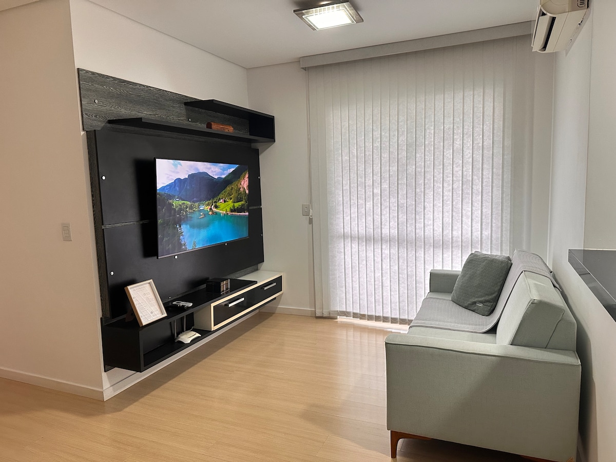 Esse apartamento além de encantador é super confortável, possui: - Porta com fechadura digital - ar condicionado em todos ambientes - Wi-Fi de 350 mega - Jacuzzi para 2 pessoas com hidro - Churrasqueira à carvão - Cozinha completa - TV smart na sala e quarto, 43'' - Camas Castor, com pillow e molas ensacadas - Roupas de cama e banho - Duchas à gás - Lavanderia com máquinas de lavar/secar - Secador de cabelos - Ferro e tábua de passar - Uma vaga de garagem gratuita