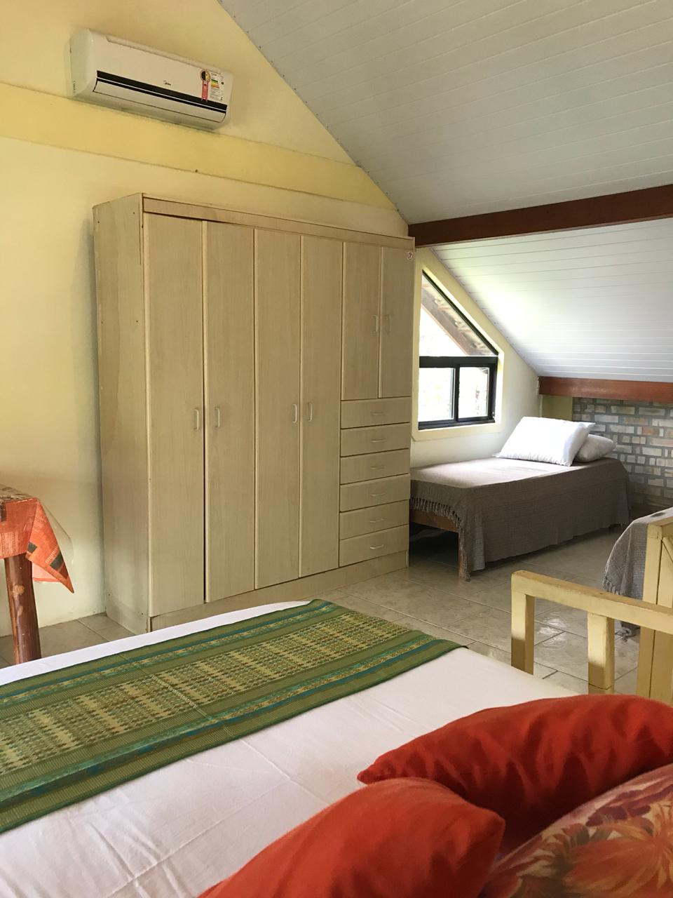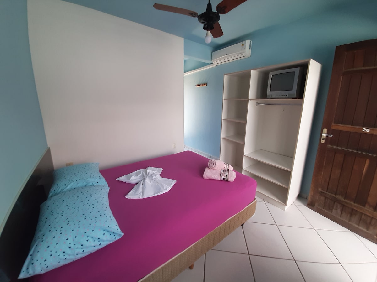 Confortáveis quartos equipados com ar-condicionado, TV e Wi-Fi gratuito. Nossas suítes acomodam até 4 pessoas da mesma família (uma cama queen e duas de solteiro) + 1 banheiro privativo.
