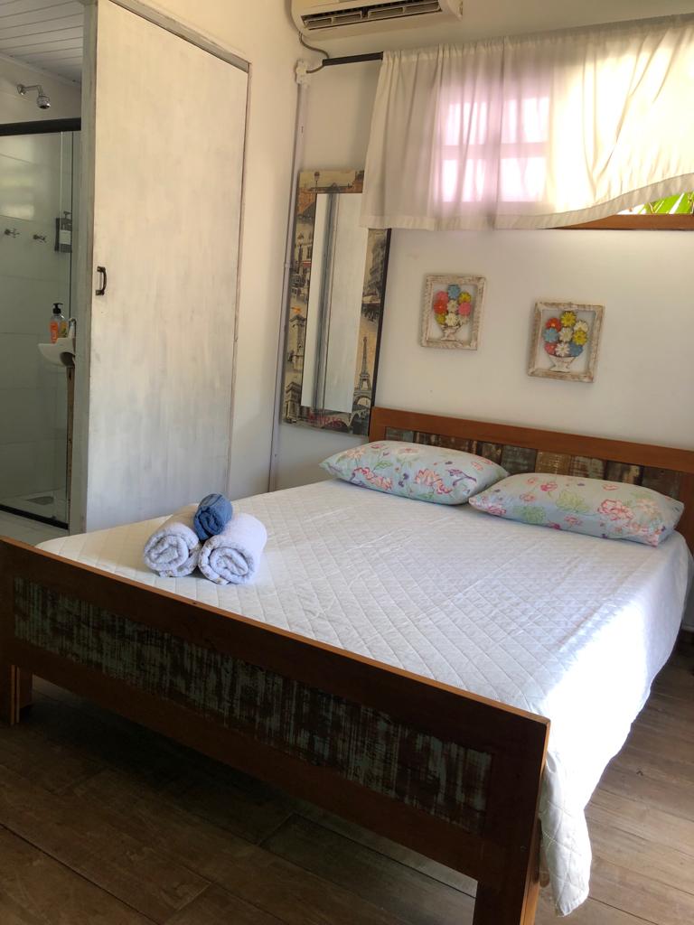 Quarto 2: Inclui uma cama box casal, frigobar, ar condicionado e uma smart TV de 42” com acesso livre ao Netflix. O banheiro privativo dispõe de chuveiro a gás, secador de cabelos, além de toalhas de banho, rosto e piso.