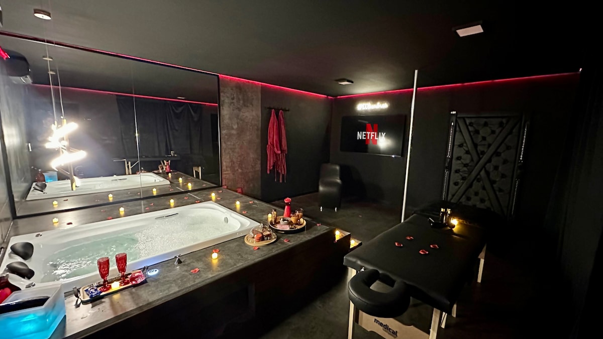❤️🔥 Descubra a 1001 Sombras de Amor — Jacuzzi Experience, refúgio sensual no bairro Tabuleiro – Camboriú (SC), a poucos minutos de Balneário Camboriú. 💎 💎Jacuzzi privativa, cama king-size inquebrável, espelho no teto, barra de strip, cruz de St andrée e iluminação envolvente criam o cenário perfeito para libertar o prazer e viver o desejo sem limites. 🎬 70" Cinema virado para a cama com Netflix, Prime Vídeo, Disney+, Spotify. 💋 Aqui, o luxo encontra a paixão — e a imaginação é o limite.