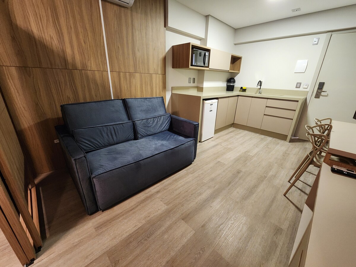 O Studio 910 oferece ambiente integrado e aconchegante. • Cama confortável • Sofá • Cozinha compacta com frigobar e microondas. • Banheiro privativo com aquecimento central • Ar-condicionado • Wi-Fi liberado Localização privilegiada: no centro da cidade e a apenas 400 metros da praia (rua reta ao mar). Próximo a farmácias, conveniências, mercado, restaurantes, padarias. Garagem/ Estacionamento não disponível.