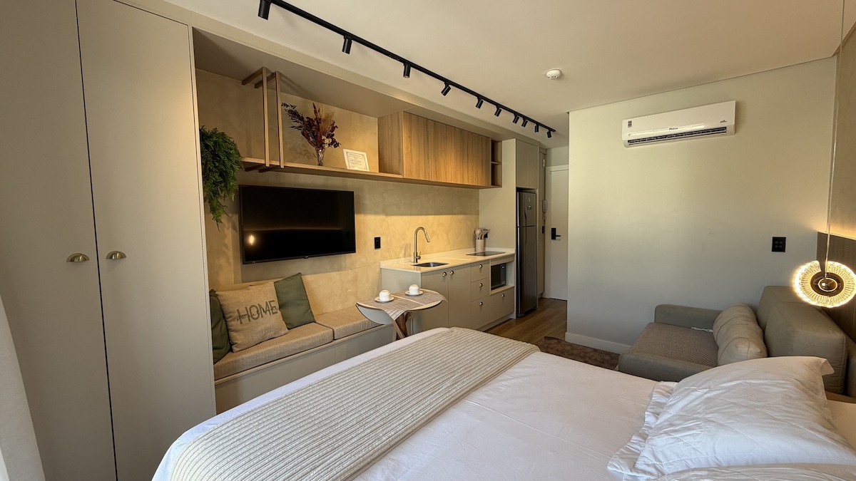 O Studio 802 oferece ambiente integrado e aconchegante. Conta com cama confortável e sofá; cozinha compacta com frigobar e microondas; banheiro privativo com aquecimento central, Ar-condicionado, Wi-Fi, TV streaming. • Portaria 24 horas Localizado no centro e a apenas 400 metros da praia. Garagem para um veículo compatível com o elevador veicular. Não aceito camionete nem alguns SUV, devido às limitações do equipamento. Nas proximidades existem opções de estacionamentos pagos à parte.