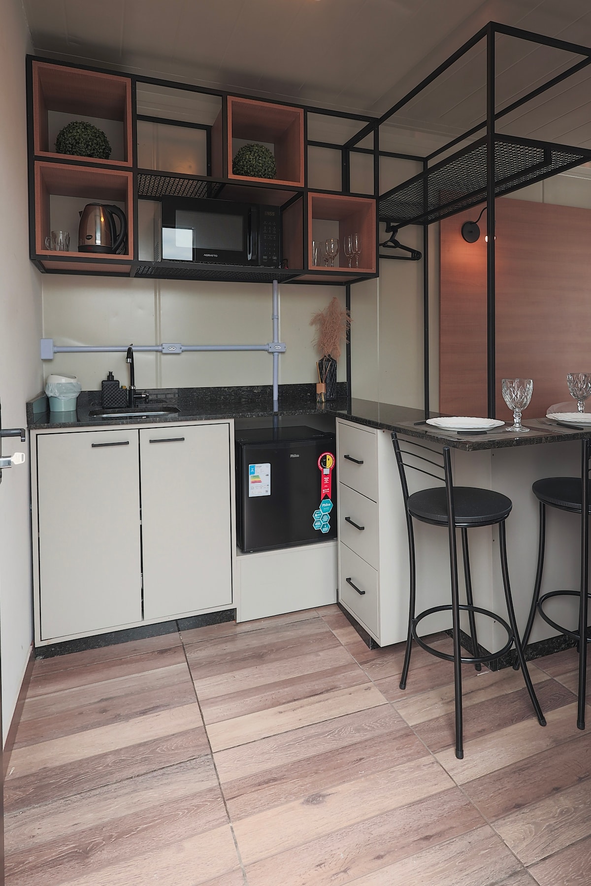 Estúdio compacto para casal em casa container. Sala, cozinha e quarto integrados, com banheiro privativo. Estilo moderno e aventureiro, para casais que buscam vivências e não luxo. Não falta água durante todo o ano. Localizado a 1,2 km da praia de Zimbros. Possui ar condicionado quente e frio. Jacuzzi não aquecida a disposição dos hóspedes.