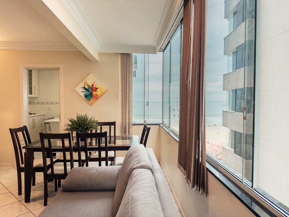 Apartamento novo a 50 metros, a pé, da praia, localizado bem no calçadão da Avenida Central com acesso a restaurantes, bares, supermercados e a área comercial da cidade. A poucos passos da Avenida Atlântica e da Avenida Brasil. O apartamento hospeda confortavelmente dois casais, um casal em uma cama box e o outro casal em um sofá-cama na sala. O local é ideal para aproveitar tudo o que Balneário Camboriú tem de melhor: a praia, a roda gigante e o parque Unipraias.
