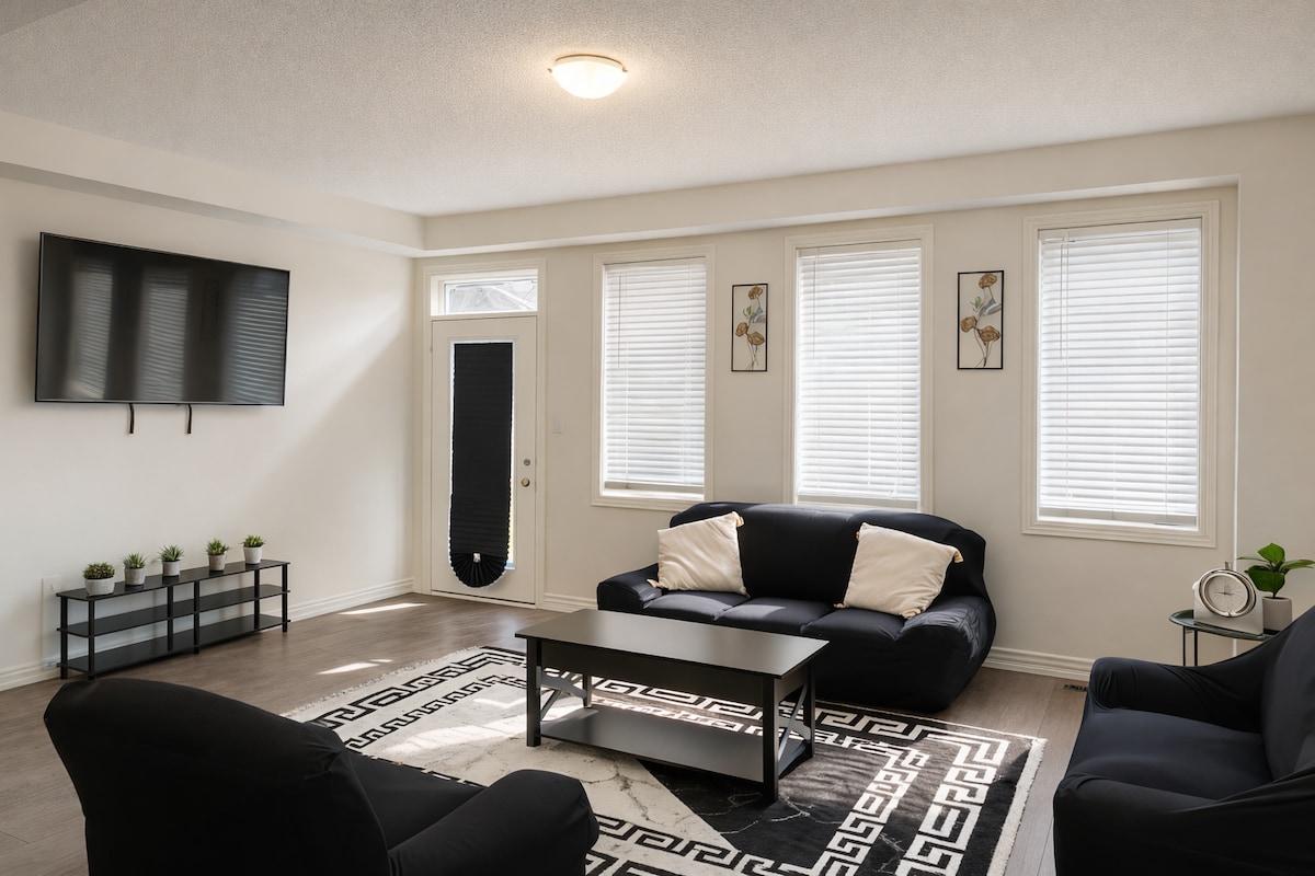 Forget your worries in this spacious and serene space. Enjoy this peaceful new townhouse with various features. A nice gorgeous view of the backyard with cozy vibes in the main floor. Gorgeous retreat in Guelph with a peace of mind stay. Spacious bedrooms with luxurious furniture in the heart of the city. Around the City: - 8 Mins from Stone Road Mall (Food, Shopping etc) - 8 Mins from University of Guelph - 8 Mins from Downtown Guelph ( Restaurants, Bars ) - 25 Mins from Halton Premium Outlet