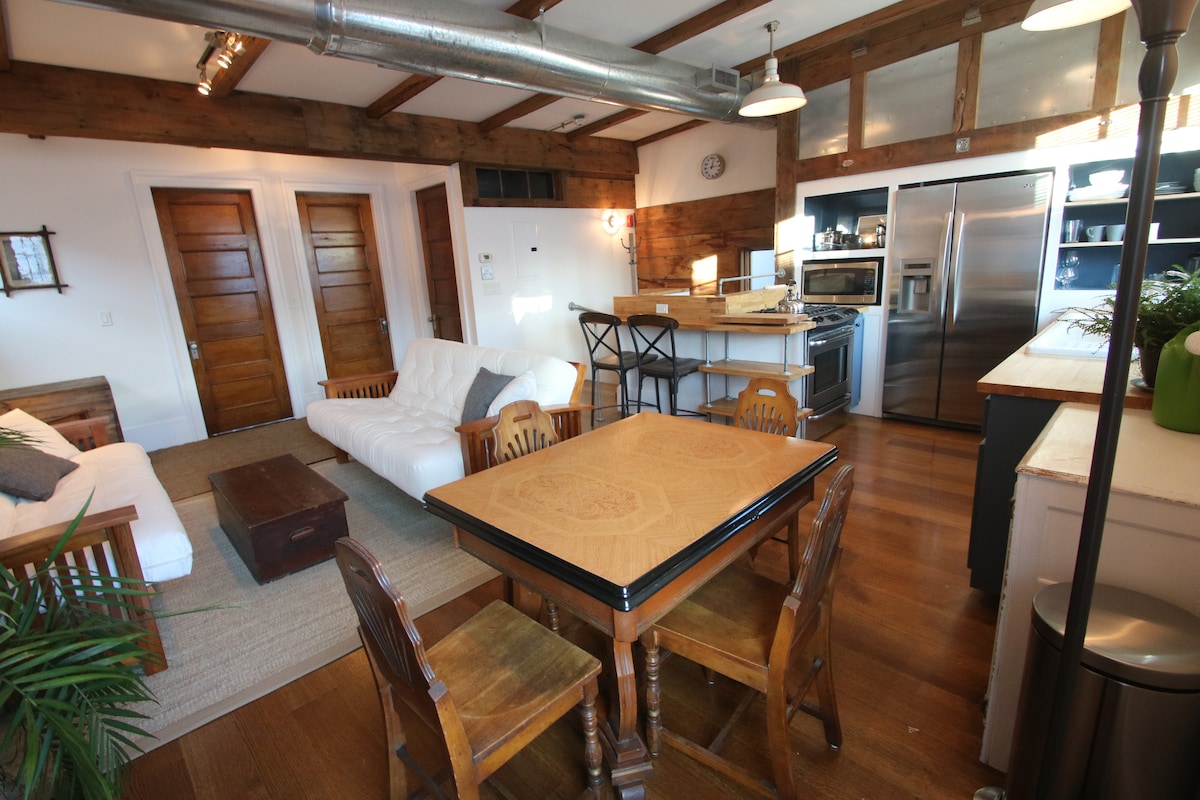 Welcome to Hipster Basecamp, a curated space where mid-century design meets modern comfort. Whether you're here for business or pleasure, enjoy bold touches like a double-sided fireplace, Smeg appliances, and a ceiling-mounted rain shower. Brew espresso or mix cocktails with everything at your fingertips, then head to the deck to unwind and take in the peaceful view. Admire original artwork throughout — and if a piece speaks to you, it's available for purchase.