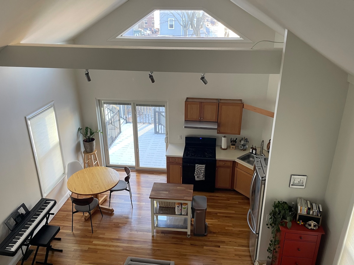 This 600 sf apt with roof deck on the third floor of an old Victorian home is bright and airy. Surrounded trees it does become a sanctuary, a place to call "home". Centrally located and within walking distance to MIT, Novartis, Harvard. It is within minutes walk to the Central Sq subway, station. The apartment is efficiently laid out with a loft feel. It has a bedroom with king size bed, bath, kitchen, and living area with a ligne roset pullout couch/bed, plus a 230 feet deck.