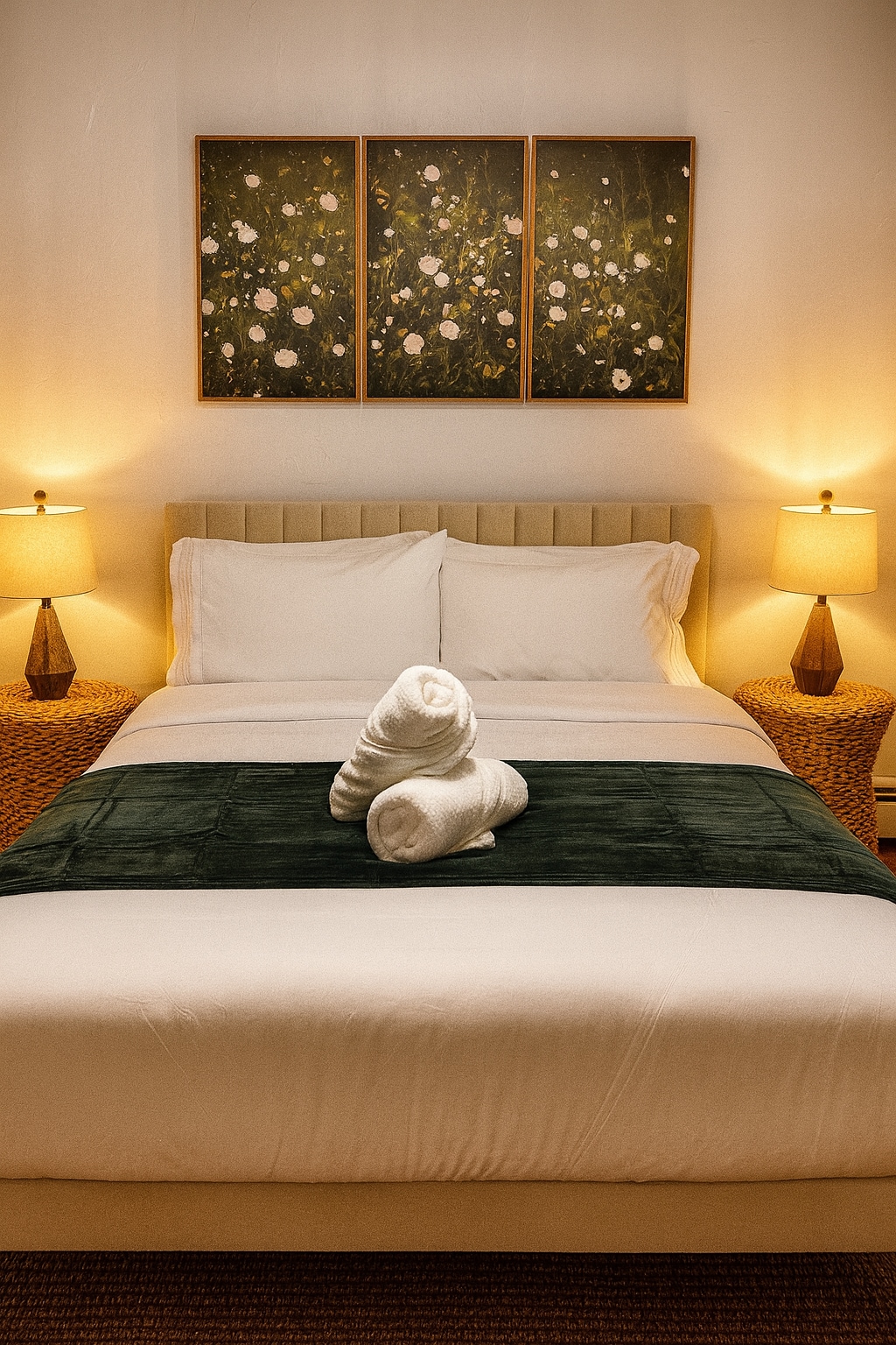 Welcome to Hipster Basecamp, a curated space where mid-century design meets modern comfort. Whether you're here for business or pleasure, enjoy bold touches like a double-sided fireplace, Smeg appliances, and a ceiling-mounted rain shower. Brew espresso or mix cocktails with everything at your fingertips, then head to the deck to unwind and take in the peaceful view. Admire original artwork throughout — and if a piece speaks to you, it's available for purchase.