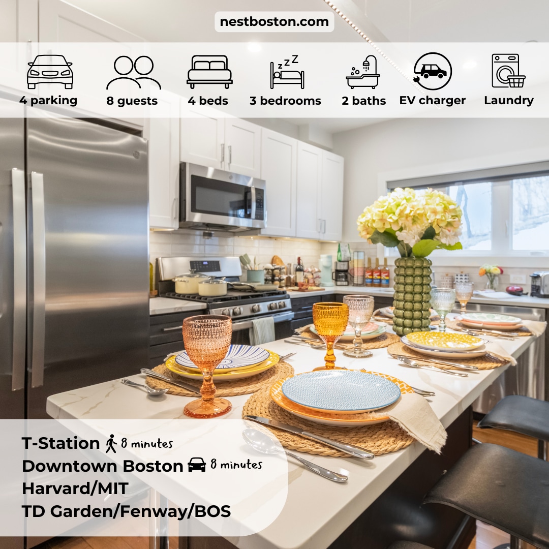 Where Boston Character Lives Free parking (2 spots) + EV charger - BONUS parking before сheck-in/after check-out is available 8 min walk to Union Square/Lechmere T-Station Family, Baby & Pet friendly 1st-floor unit FREE luggage/stroller storage before check-in/late check-out In-unit Washer&Dryer Enjoy spacious accommodations, parking, and a fantastic location with fast access to downtown Boston and Cambridge. You'll be near Kendall Square, MIT, Harvard, and many dining and shopping options.