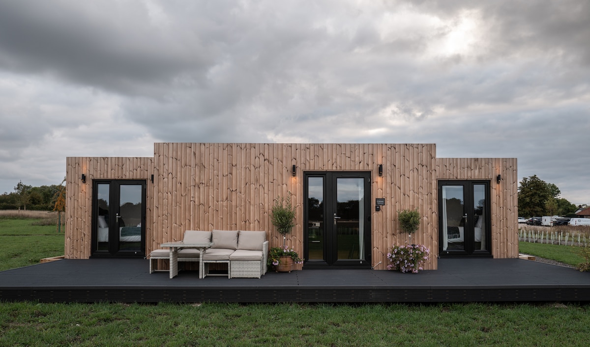 Badger cabin is a 2 bed cabin which has 1 double bed room and 1 twin bedroom. Badger cabin can comfortably sleep 4 people but also has the capacity to sleep up to 6 upon request. The cabin contains a lounge and dining area, a kitchen area, a shower room, a W.C. and 2 bedrooms. Badger cabin is dog friendly, £10 additional charge per dog per night. The cabin is located on a farm in Essex countryside by a lake. The cabin has a private wood fire hot tub. We have 5 cabins in total. Postcode CB10 2XG
