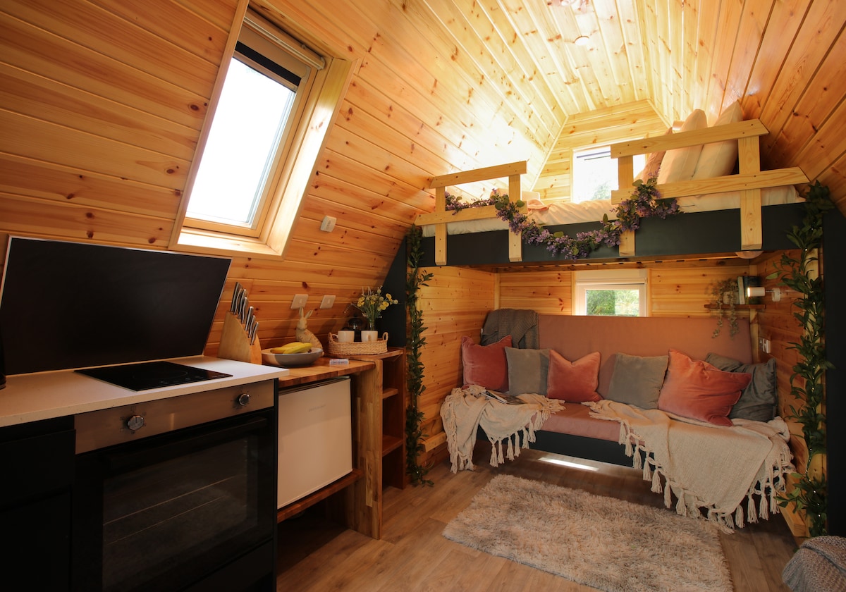 What makes Gresley Cabin unique is its Scandinavian Pine construction. Spacious, yet cosy and warm equipped with air conditioning and underfloor heating. The mezzanine is carpeted open plan overlooking the ground floor and fitted with a double bed which can be split into 2 singles. Downstairs there is an open plan living/kitchen with 65" Colour TV, bathroom/shower, double bedroom and a separate low temperature Far Infra Red Sauna. There's also an EV Charger on-site which can be used by guests.