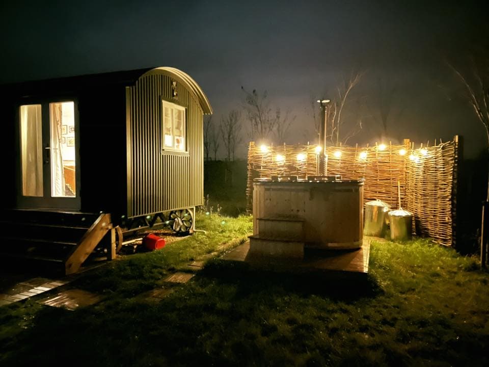 You will love this romantic escape in a luxury shepherds hut. With a cosy wood burning stove and underfloor heating for when you need extra cosiness, a king size bed, kitchen and double rainforest shower. We also have a selection of board games. Outside you have your own private wood fired hot tub and BBQ with countryside views while at night you can gaze up at the stars on your star gazing bed, which also makes a superb sunbed during the day!