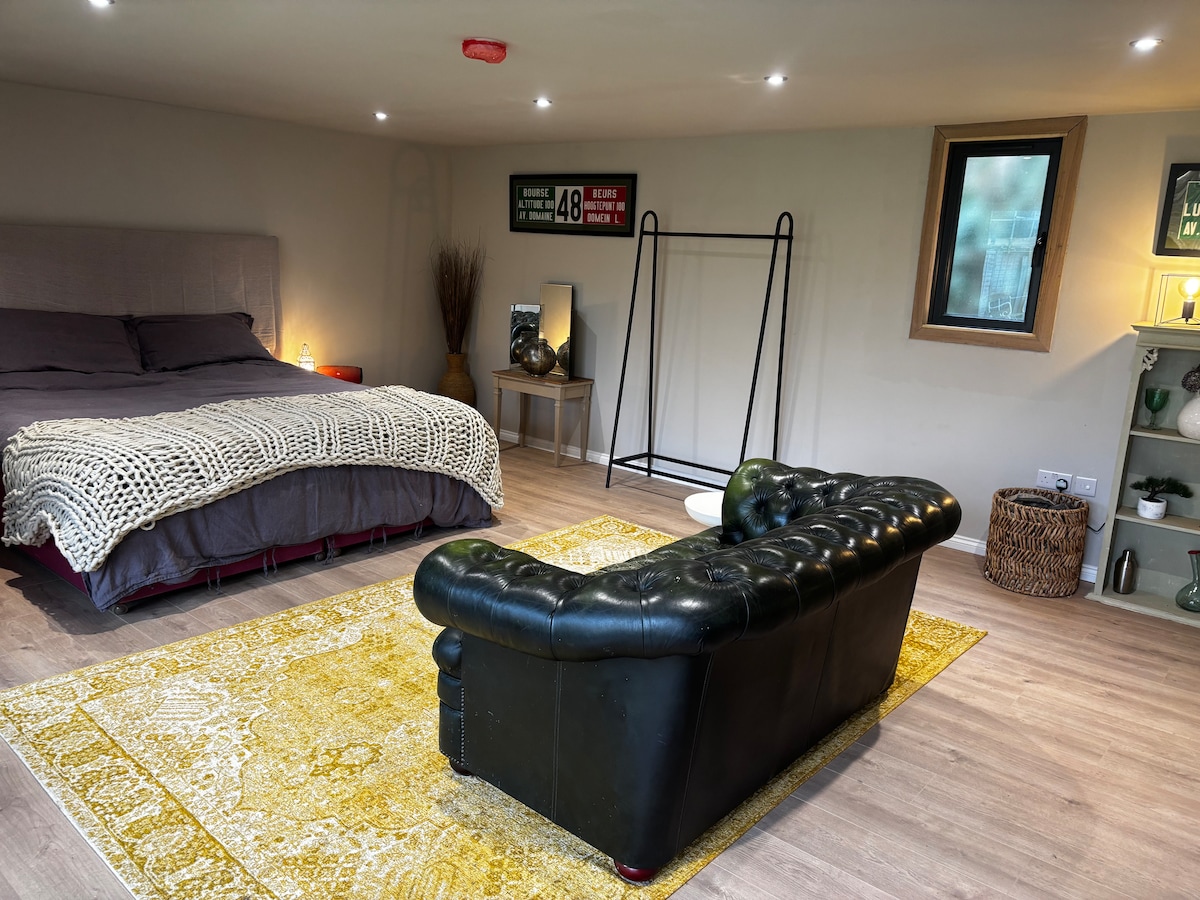 What makes Gresley Cabin unique is its Scandinavian Pine construction. Spacious, yet cosy and warm equipped with air conditioning and underfloor heating. The mezzanine is carpeted open plan overlooking the ground floor and fitted with a double bed which can be split into 2 singles. Downstairs there is an open plan living/kitchen with 65" Colour TV, bathroom/shower, double bedroom and a separate low temperature Far Infra Red Sauna. There's also an EV Charger on-site which can be used by guests.