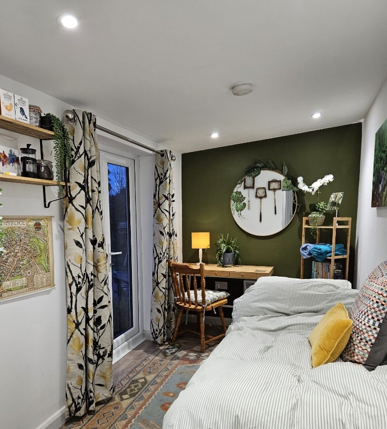 Beautifully appointed double room with its own shower-room and mini-kitchen. Light, bright and luxurious all in one go. The cabin is accessed via the side passage of the main house, meaning you can come and go as you please. A lit path winds down the garden to this gorgeous cedar-clad structure with a meadow roof and nature walls. You’ll feel like you’re in a country hideaway whilst also being very centrally located. Inside it’s light and airy whilst also quiet and cosy.