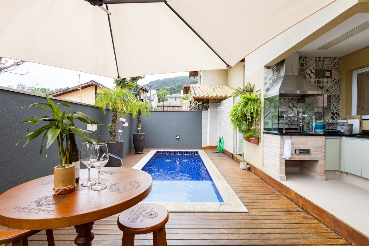 Casa recém construída, espaçosa e pertinho da praia. São 3 suites espaçosas no andar superior e um dormitório de apoio semi suíte no térreo! Com área gourmet, piscina linda com prainha, amplo deck para receber os amigos e com proteções para as crianças, sala e cozinha integrada que se estende a área gourmet! Estar externo confortável com ventiladores e todos os cômodos da casa com ar condicionado. A casa fica a 2minutos a pé da praia