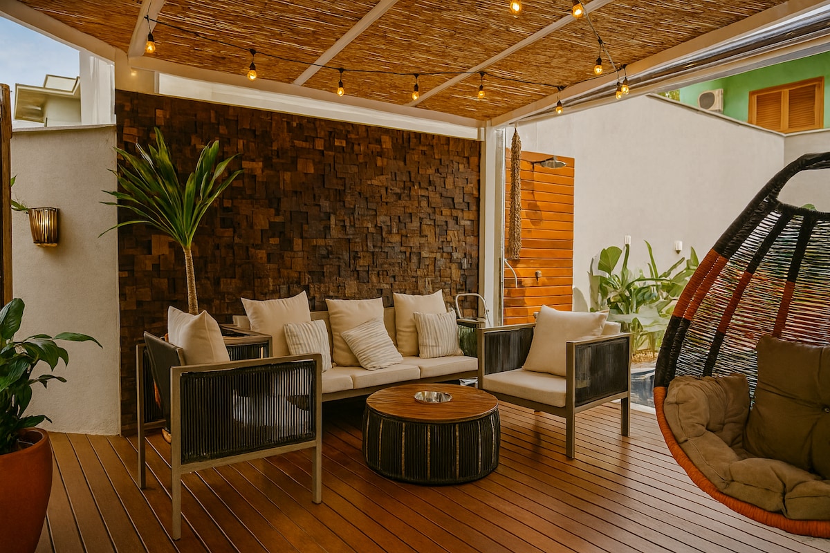 A poucos passos da praia, esta casa tropical cercada por grande jardim é um refúgio perfeito para famílias. Com 4 dormitórios, a casa acomoda até 10 pessoas. Há suíte no térreo, ideal para idosos ou pessoas com mobilidade reduzida. Todos os ambientes têm ar-condicionado, inclusive a cozinha, e a sala conta com lareira aconchegante. Os espaços externos são destaque, com terraço coberto, mesa grande, sofás, redes e churrasqueira, além de jardim tropical iluminado à noite.