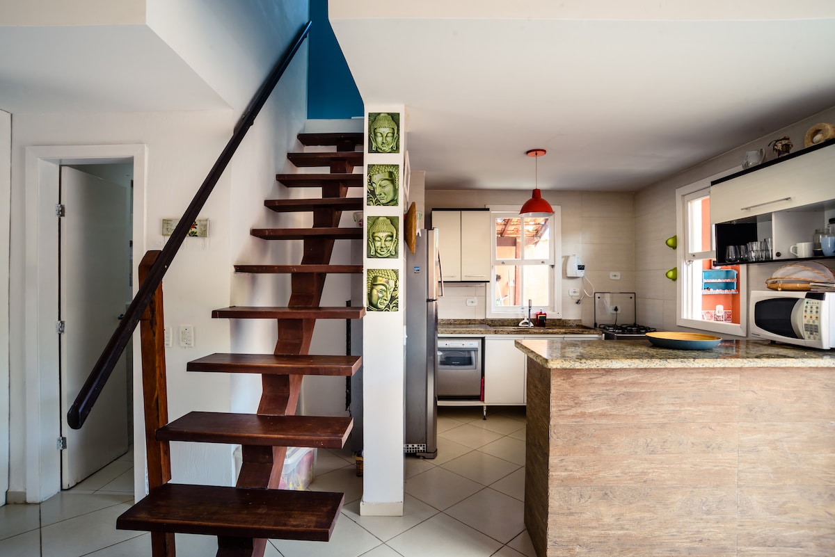 Casa com estilo e conforto , suíte 5 estrelas (chuveiro a gas e banheira grande para dois com hidro, ar condicionado, ventilador teto, colchao queen de qualidade, lençois de algodao 400 fios ,TV, WIFI rapido - dois provedores, varanda com rede, vista para mata atlantica e closet espaçoso. Para seu conforto extra - lareira, cozinha completa e kiosque-churrasqueira , piscina para dois sauna e rio tudo privativo. Jardim cercado para seu pet. Condominio tranquilo, acesso fácil as praias.