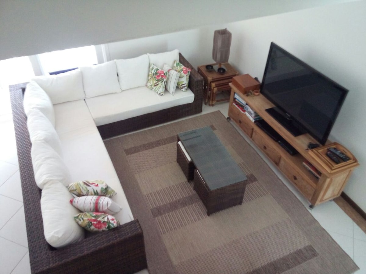 Casa em condominio no alto, facil acesso, a menos de 10 min das praias do centro. A suite master é muito confortavel tal qual um hotel de charme. Chuveiro com banheira ampla para 2, toda envidraçada e com vista para mata. Colchao Queen super confortavel, TV 43 pol nova, ar condicionado e deck com vista mata atlantica. Rio corre a poucos metros da suíte. Internet com dois provedores. Chuveiro opcional externo e quente.