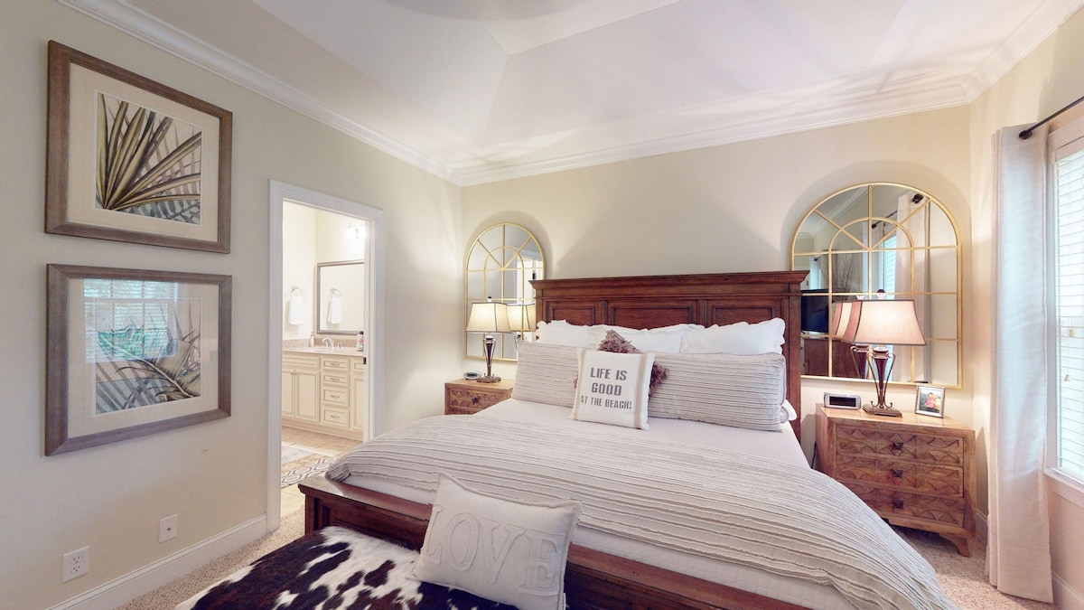 The Freddie is a newly updated 3-bedroom, 3.5-bathroom coastal cottage in the heart of St. Simons Island. It features an open floor plan with a fully equipped kitchen, dining area for six, living room with a fireplace, and a screened porch for relaxing. The master bedroom with a king bed is on the first floor, and upstairs offers a bunk room that sleeps five, a king guest bedroom, and a sitting area with a coffee station. All bedrooms have ensuite bathrooms. The home comfortably sleeps nine gues